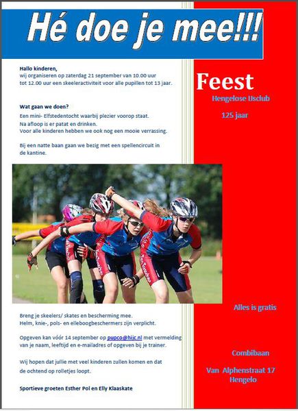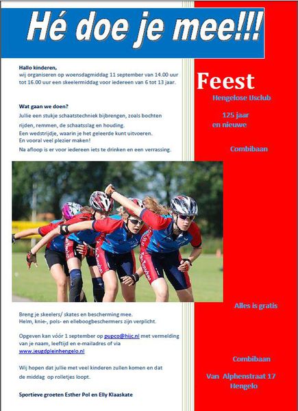 In het kader van ons 125-jarig jubileum heeft de Jubileumcommissie een skeeleractiviteit voor basisschoolkinderen in Hengelo georganiseerd in in samenwerking met www.jeugdpleinhengelo.nl Op woensdag 11 sept. van 14.00u - 16.00u op de Combibaan. Meer informatie staat in de flyer.