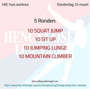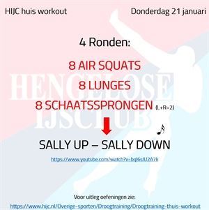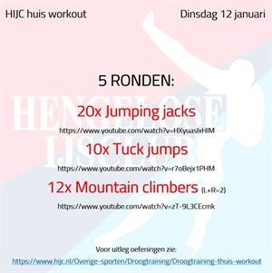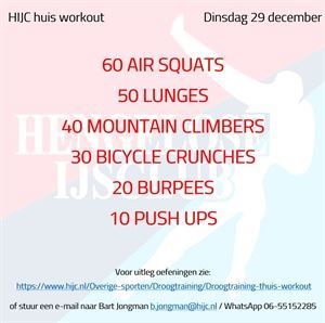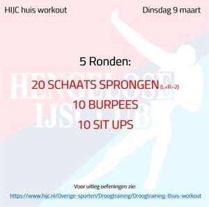 Nieuws, Winter 2020-2021, Droogtraining Workout dinsdag 22 december maandag 21 december 2020 Voor vandaag staat een mooie mix van sprongwerk met buikspieren. Probeer de 5 ronden weer op tijd uit te voeren maar vergeet daarbij uiteraard niet de techniek bij de schaatssprongen. Succes! Workout dinsdag 22 december