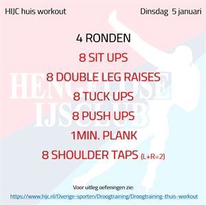 Droogtraining Workout dinsdag 5 januari maandag 4 januari 2021 Vandaag een pittige maar gevarieerde serie op het matje. Werk de 4 ronden lekker achter elkaar door, als dit wat te zwaar wordt neem dan een korte pauze tussen elke set. Workout dinsdag 5 januari