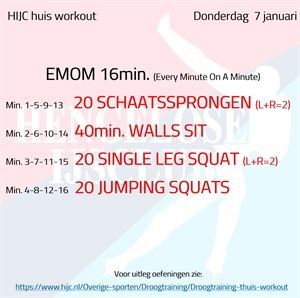 Droogtraining Workout donderdag 28 januari woensdag 27 januari 2021 Voor vandaag een EMOM (Every Minute On the Minute) programma, 2 sets van ieder 10 minuten met 2 minuten rust tussendoor. Voor elke oefening staan 10 herhalingen welke binnen de minuut uitgevoerd... Workout donderdag 28 januari