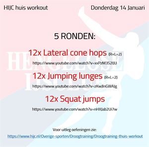 Droogtraining Workout donderdag 14 januari woensdag 13 januari 2021 Voor vandaag een programma met veel sprongwerk, waarbij de ‘lateral cone hops’ een nieuwe oefening is (vandaar de link voor uitleg). Bij de uitvoering van deze oefening kun je een... Workout donderdag 14 januari