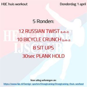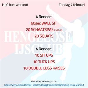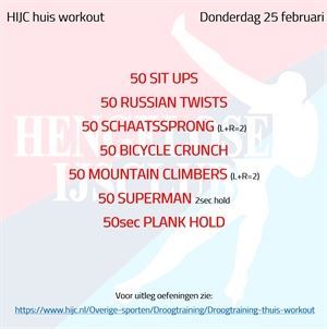 Droogtraining Workout dinsdag 2 februari maandag 1 februari 2021 Aangezien de meeste volgelingen afgelopen zondag hebben afgezien bij de HIJC Duo Challenge voor vandaag een workout waarbij je lekker op je matje kan blijven zitten en liggen ;-) Succes! Workout dinsdag 2 februari