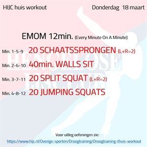 Droogtraining Workout donderdag 18 maart woensdag 17 maart 2021 EMOM oftwel ‘Every Minute On A Minute’. Voor elke oefening staat een minuut, heb je de iedere oefening met vermelde aantallen uitgeoefend, dan is steeds de resterende tijd binnen elke... Workout donderdag 18 maart