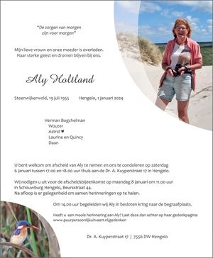 Nieuws, Winter 2023-2024 Aly Holtland overleden donderdag 4 januari 2024 Het bestuur heeft het droevige bericht ontvangen dat op 1 januari Aly Holtland is overleden. Zij was de partner van Herman Bogchelman (lid van de recreanten schaatsgroep) en moeder van Daan... Aly Holtland overleden
