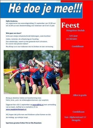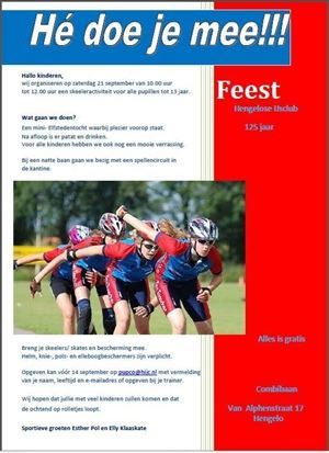 Zomer 2013 Skeeleractiviteit voor basisschoolkinderen in Hengelo maandag 26 augustus 2013 In het kader van ons 125-jarig jubileum heeft de Jubileumcommissie een skeeleractiviteit voor basisschoolkinderen in Hengelo georganiseerd. Skeeleractiviteit voor basisschoolkinderen in Hengelo