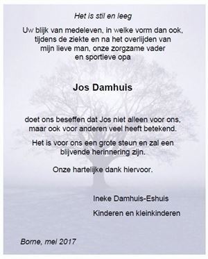 Nieuws, Zomer 2017 Dankbetuiging maandag 29 mei 2017 De familie van Jos Damhuis dankt iedereen voor uw blijk van medeleven tijdens de ziekte en na het overlijden van Jos. Dankbetuiging