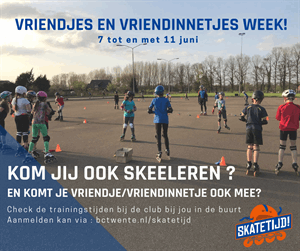 Nieuws, Zomer 2021 Skatetijd! VRIENDJES- EN VRIENDINNETJESWEEK! dinsdag 25 mei 2021 In de week van 7 juni tot en met 11 juni wordt de SKATETIJD! vriendjes- en vriendinnetjesweek georganiseerd op een aantal skeelerbanen in Twente. Pupillen kunnen in die periode tijdens hun eigen... Skatetijd! VRIENDJES- EN VRIENDINNETJESWEEK!
