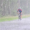 Bij het keerpunt stond Marijke te zwaaien met een rode vlag en sommige rijders keken hoopvol of dit het teken was dat de tijdrit gestaakt werd, maar nee. Een enkeling was de regen niet gek genoeg en reed nog wat extra meters: Job nam het keerpunt heel ruim en reed helemaal door tot de parkeerplaats.