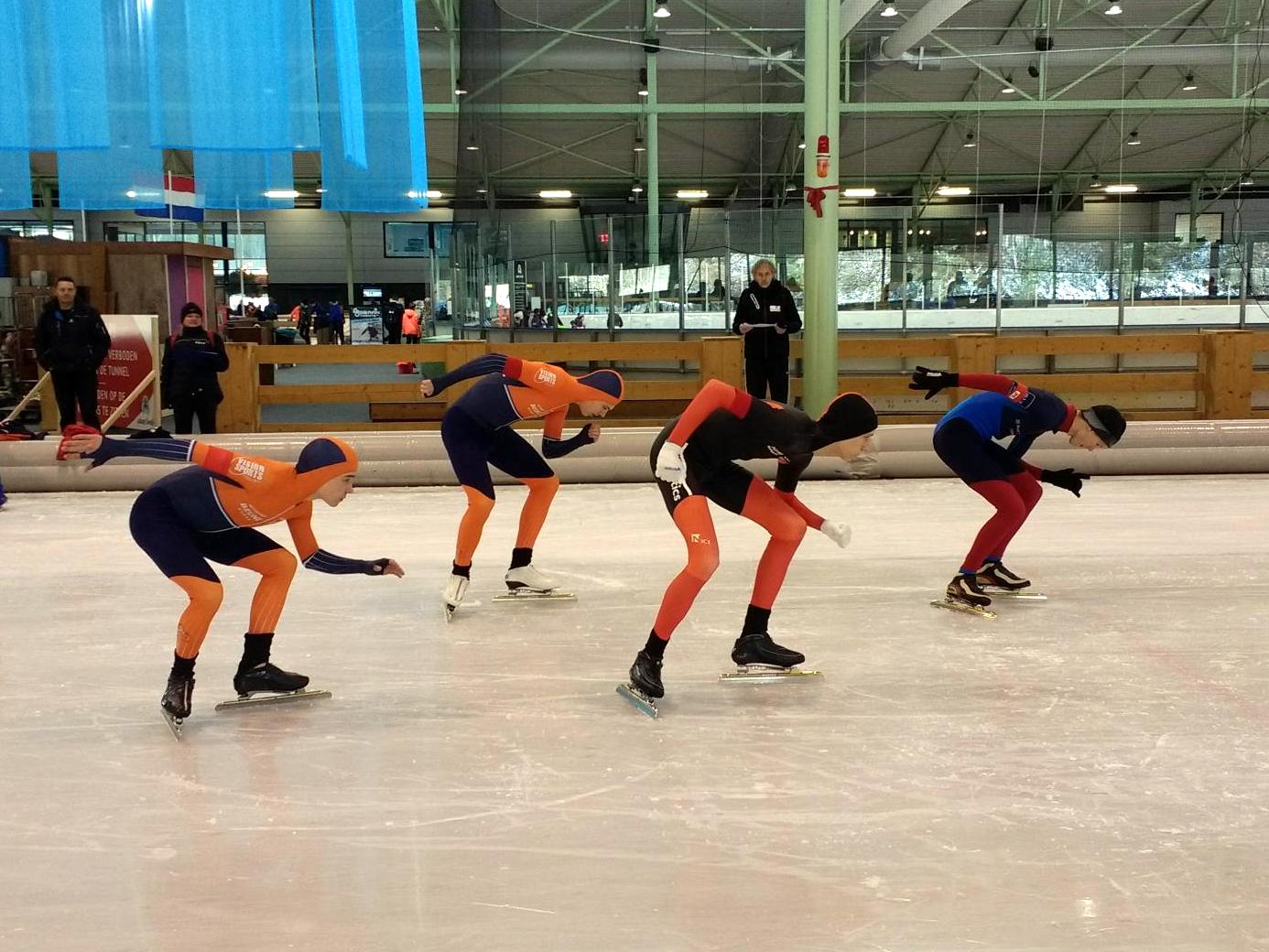 De scholenploegenachtervolging is een leuke wedstrijd omdat de categorieën licentierijders en niet-licentierijders om de beurt rijden. En ook omdat leden van verchillende ijsclubs zijn gemixt, omdat het in dit geval om de eer van de school gaat.