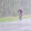 Bij het keerpunt stond Marijke te zwaaien met een rode vlag en sommige rijders keken hoopvol of dit het teken was dat de tijdrit gestaakt werd, maar nee. Een enkeling was de regen niet gek genoeg en reed nog wat extra meters: Job nam het keerpunt heel ruim en reed helemaal door tot de parkeerplaats.