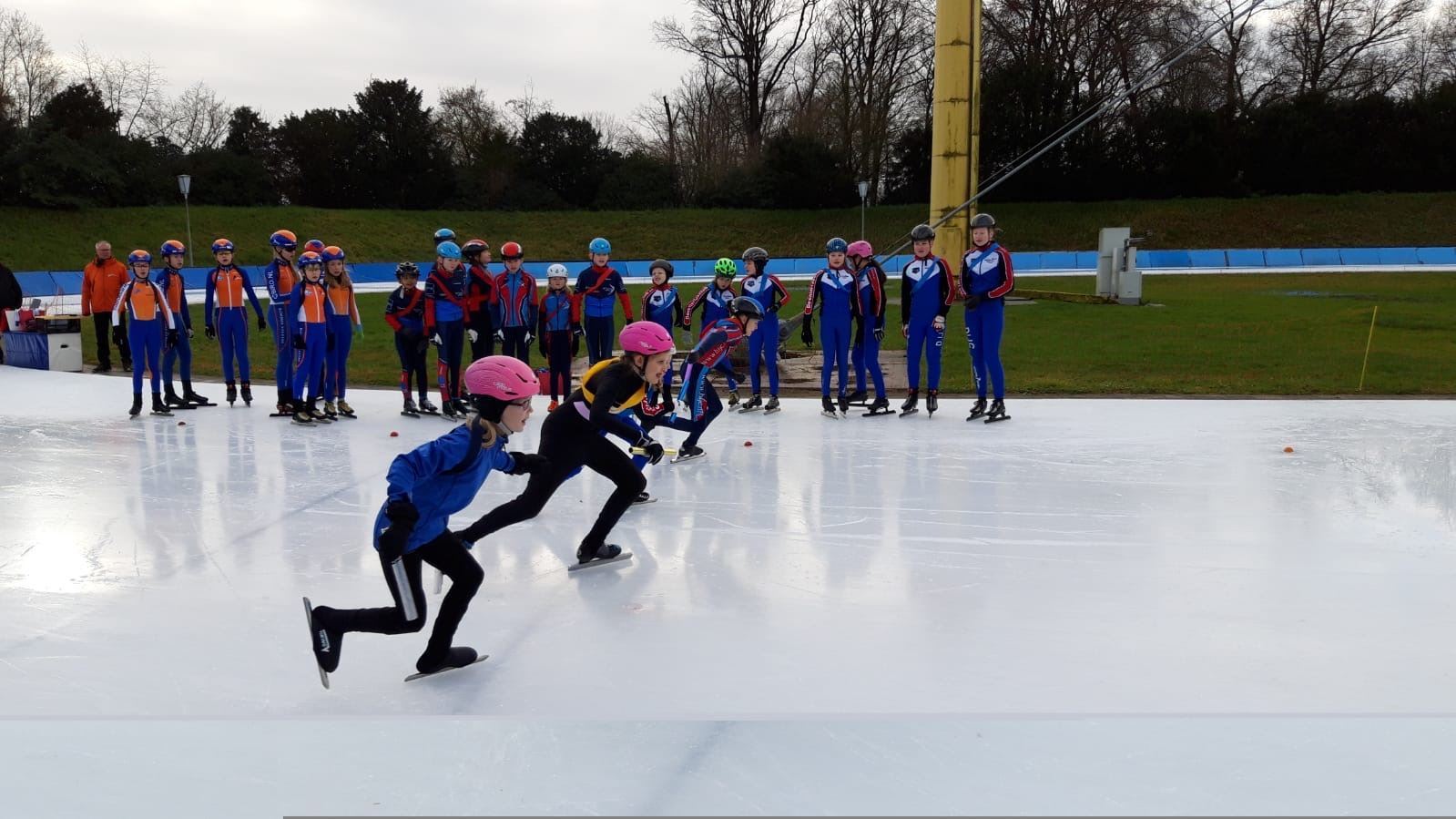 Bij aannkomst op de buitenbaan (wat zijn wij toch verwend met onze overdekte ijsbaan in Enschede) bleek het flink te regenen en dachten de kinderen dat de wedstrijd wel uigesteld zou worden. Maar er werd gewoon gestart, daar keken enkele wel een beetje vreemd van op. Dat ze toch gestart zijn was achteraf best wel stoer. Doorweekt kwamen ze de baan af na de eerste afstand. Mart zegt daarover: 'Ik zag niks, want ik moest alleen maar knipperen.' Gelukkig werd het na de eerste afstand droog en konden ze de tweede afstand en de estafette droog afleggen. Wat een beleving was dat. Deze dag zullen Eloise van der Sligte, Esmee en Thomas Hesselink, Ahmad Hafeez, Evelien Gosselink, Elisa Stenvers, Tom Kromhout van der Meer en Mart Polman nog lang onthouden.