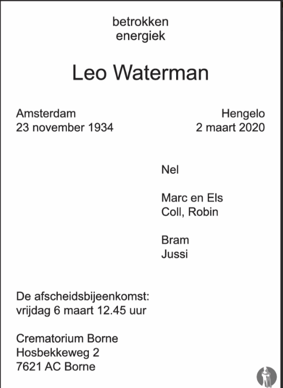 Leo Waterman overleden Onlangs is op 2 maart 2020 Leo Waterman overleden. Wij wensen de familie en vrienden van Leo heel veel sterkte. Hengelose IJsclub donderdag 5 maart 2020 Aantal weergaven (2737) Trefwoorden: in memoriam Mocht u het niet eens zijn met de publicatie van een foto kunt u dat per e-mail kenbaar maken aan de webmaster (webmaster@hijc.nl). De foto wordt dan zo snel mogelijk verwijderd.