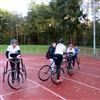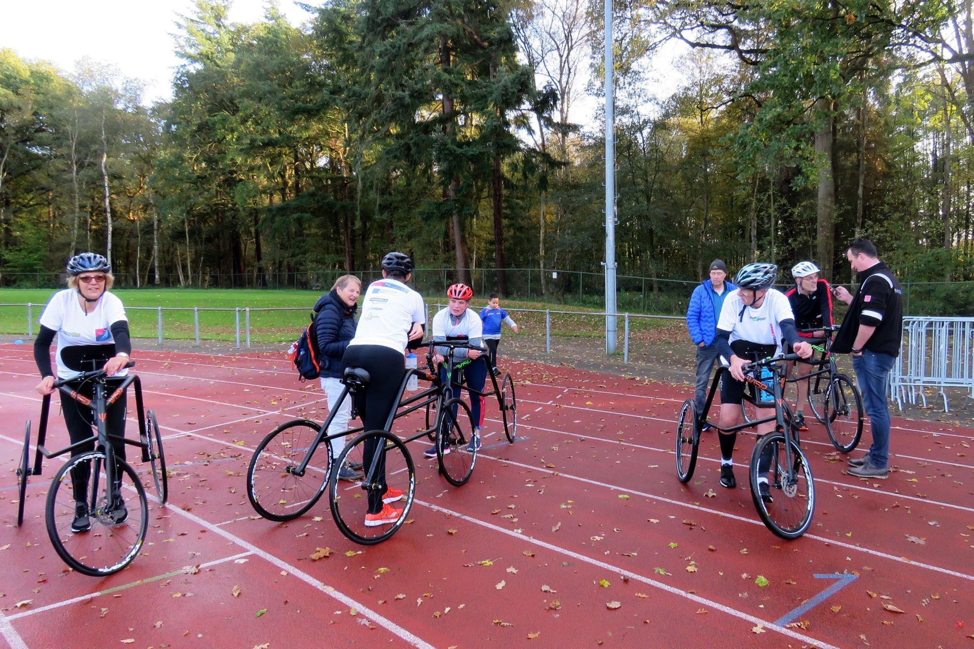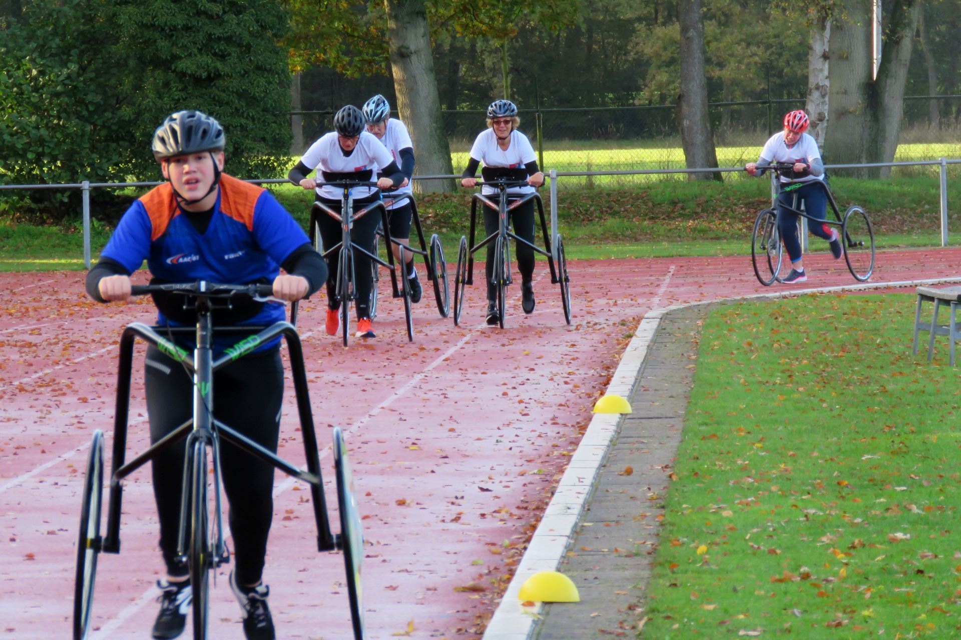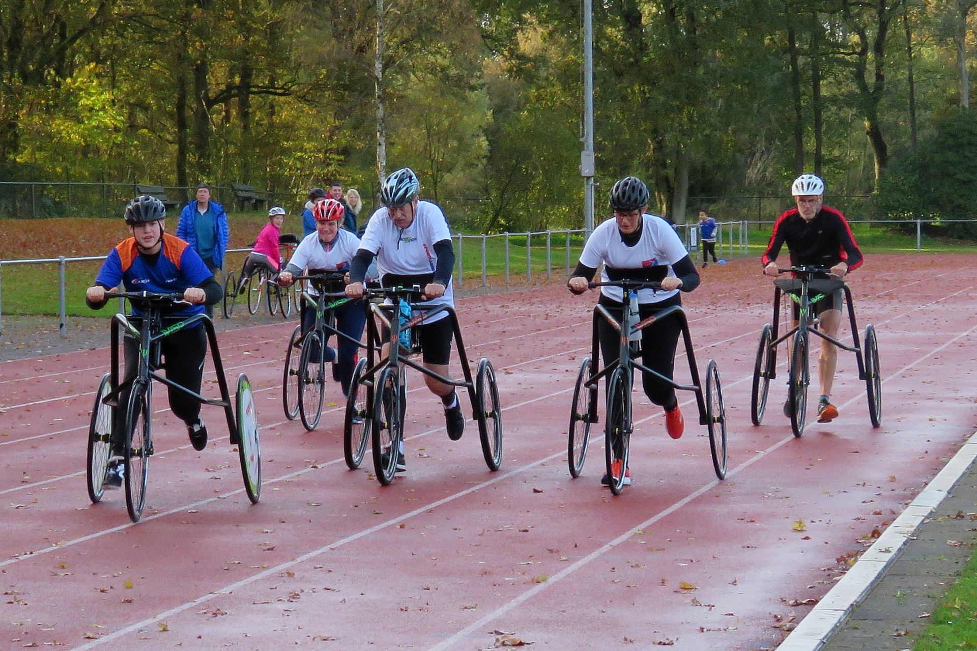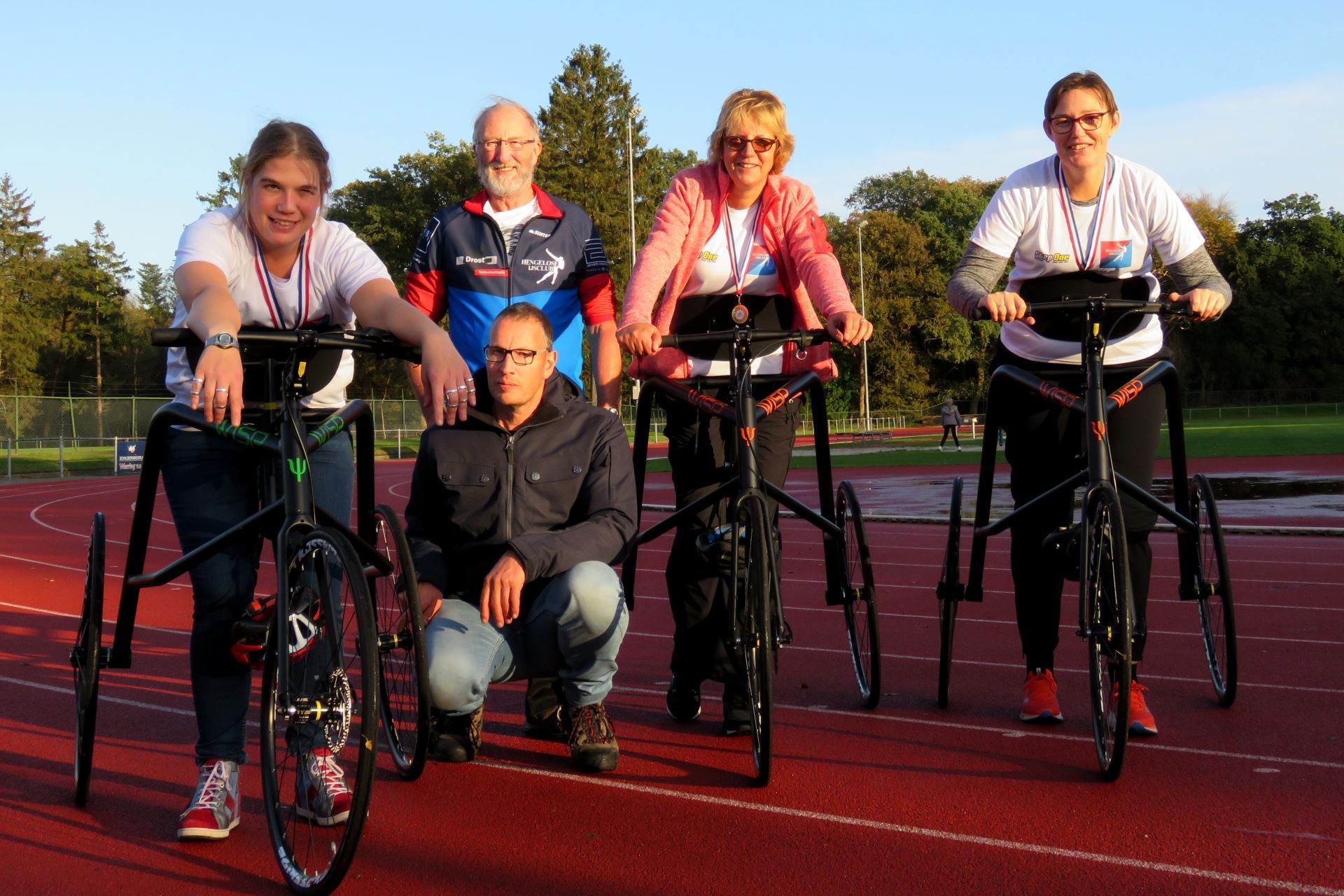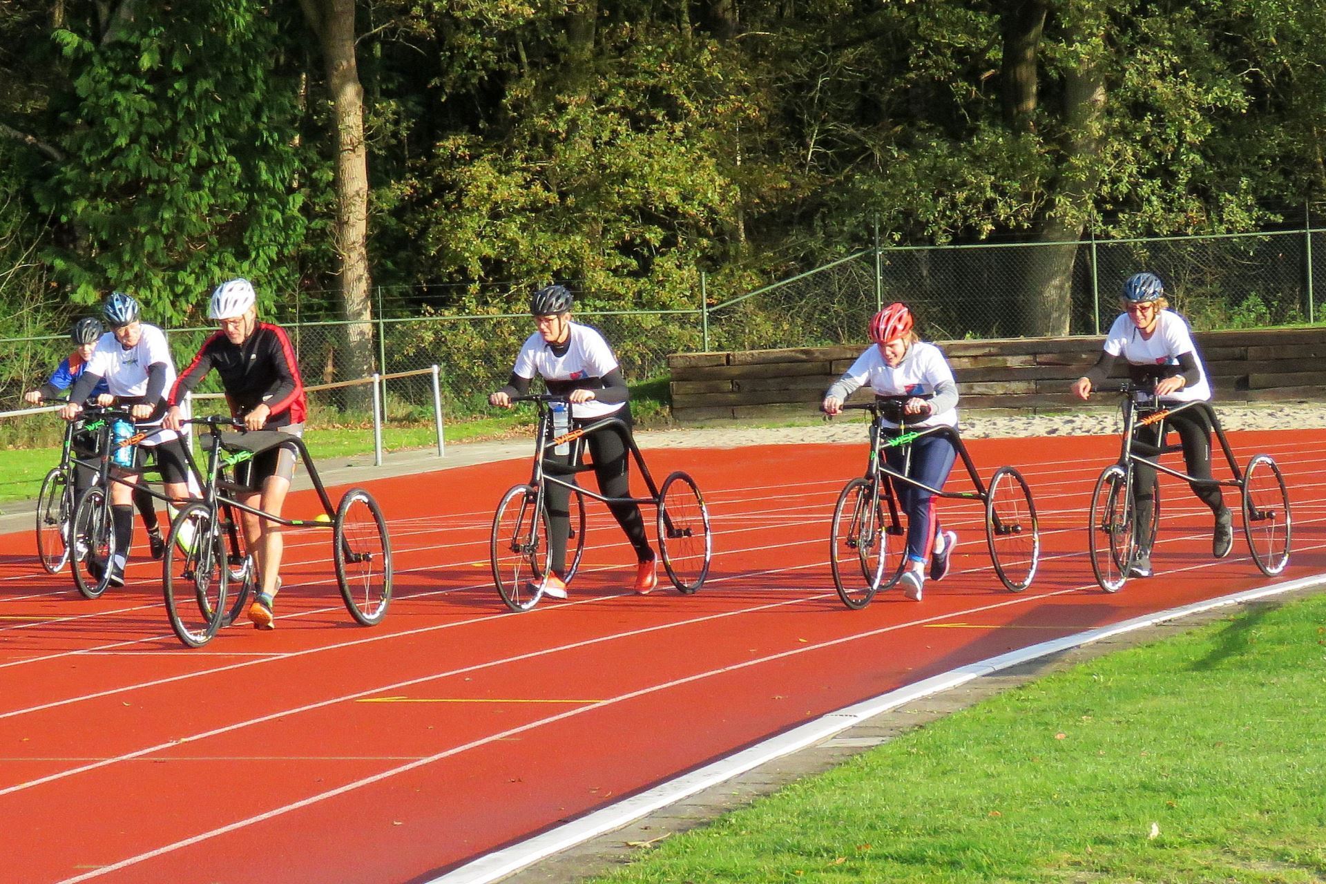 Vanuit Hengelo deden Cora, Maartje en Gerlinda mee. Verder waren er nog 14 deelnemers uit de omgeving Assen en Emmen, variërend in de leeftijd van 6 tot in de 60! Voor ons was het de eerste kennismaking met een wedstrijd op een atletiekbaan en er werd dus van ons verwacht dat wij netjes tussen de lijntjes liepen😉De sfeer was gezellig en ongedwongen en het was geweldig om te zien hoe jong en oud met welke beperking dan ook met de racerunner in staat is om te sporten en er ieder voor zich uit wil halen wat erin zit.