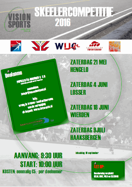 Er worden deze zomer vier skeelerwedstrijden georganiseer door de Vision Sports Skeelercompetitie. Je mag aa aan één wedstrijd meedoen maar ook aan allemaal. De kosten voor deelname aan de Vision Sports Skeelercompetitie bedragen € 5,00 per deelnemer. Voor dit bedrag mag je aan alle vier wedstrijden deelnemen.