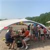 Het terras voor het clubhuis was sfeervol ingericht met parasols, een partytent en een gezellig muziekje.