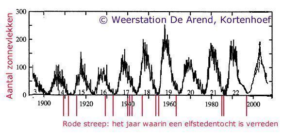 Ik heb bij Remco nog wat nieuwe onderdelen gekocht voor mijn natuurijs schaatsen en me aangemeld voor de Alternatieve 11-stedentocht op de Weissensee. Wat mij betreft mag het gaan vriezen. Volgens de Enkhuizer Almanak krijgen we deze winter vorst, als je het aantal zonnevlekken uitzet in jaren dan volgt uit deze grafiek dat we dit of volgend jaar de 11-stedentocht kunnen rijden. Kortom, het ziet er goed uit ……..volgens de geleerden.