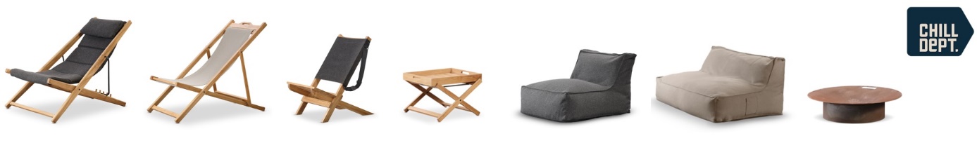 De Chill-Dept. collectie bestaat oa. uit diverse opvouwbare en makkelijk verplaatsbare teak houten relax stoelen, heerlijke zachte en comfortabele outdoor zitzakken en robuuste buitenhaarden.