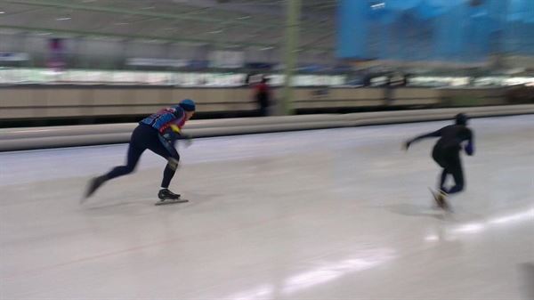 Toen eindelijk de start. Ik sprint weg en voel meteen een stekende pijn in mijn lies. Bij het (iets te enthousiast) oefenen had ik daar ook al last van gekregen. Jammer genoeg dus geen flitsende start. Ik ga snel over van rennen naar schaatsen en de pijn zakt meteen weer weg.