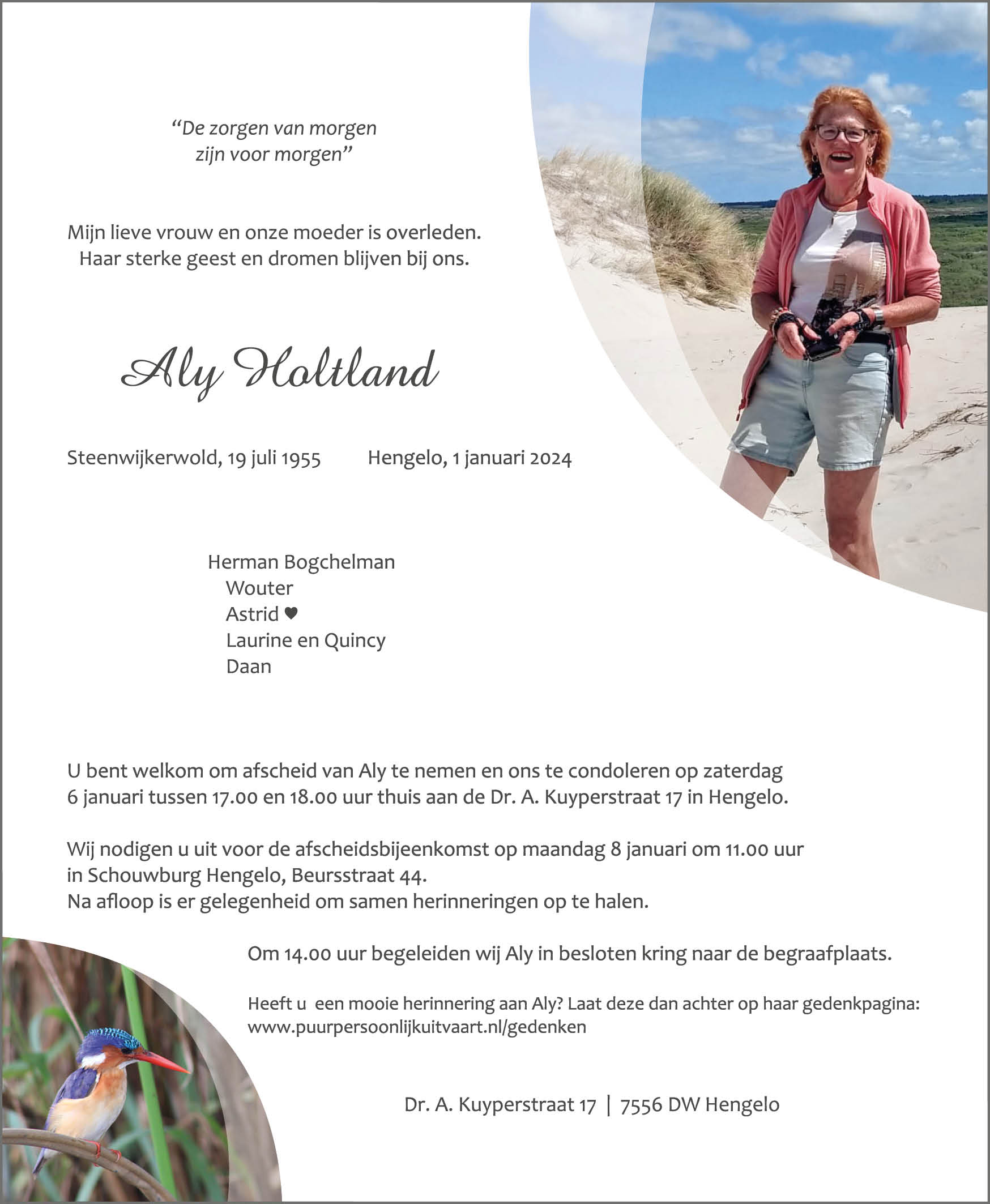 Het bestuur heeft het droevige bericht ontvangen dat op 1 januari Aly Holtland is overleden. Zij was de partner van Herman Bogchelman (lid van de recreanten schaatsgroep) en moeder van Daan Bogchelman (lid van wedstrijdgroep 2). Wij wensen Herman en de kinderen heel veel sterkte met dit verlies.