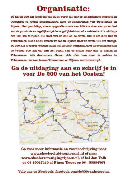 Op zaterdag 13 september 2014 wordt voor de eerste keer ‘De 200 van het Oosten’ gereden, een 200 km skeelertocht over een prachtige, nieuw uitgezette route door een groot deel van Overijssel. Deze pelotonstocht wordt georganiseerd door de skeelerclubs van Twenterand en Rijssen.