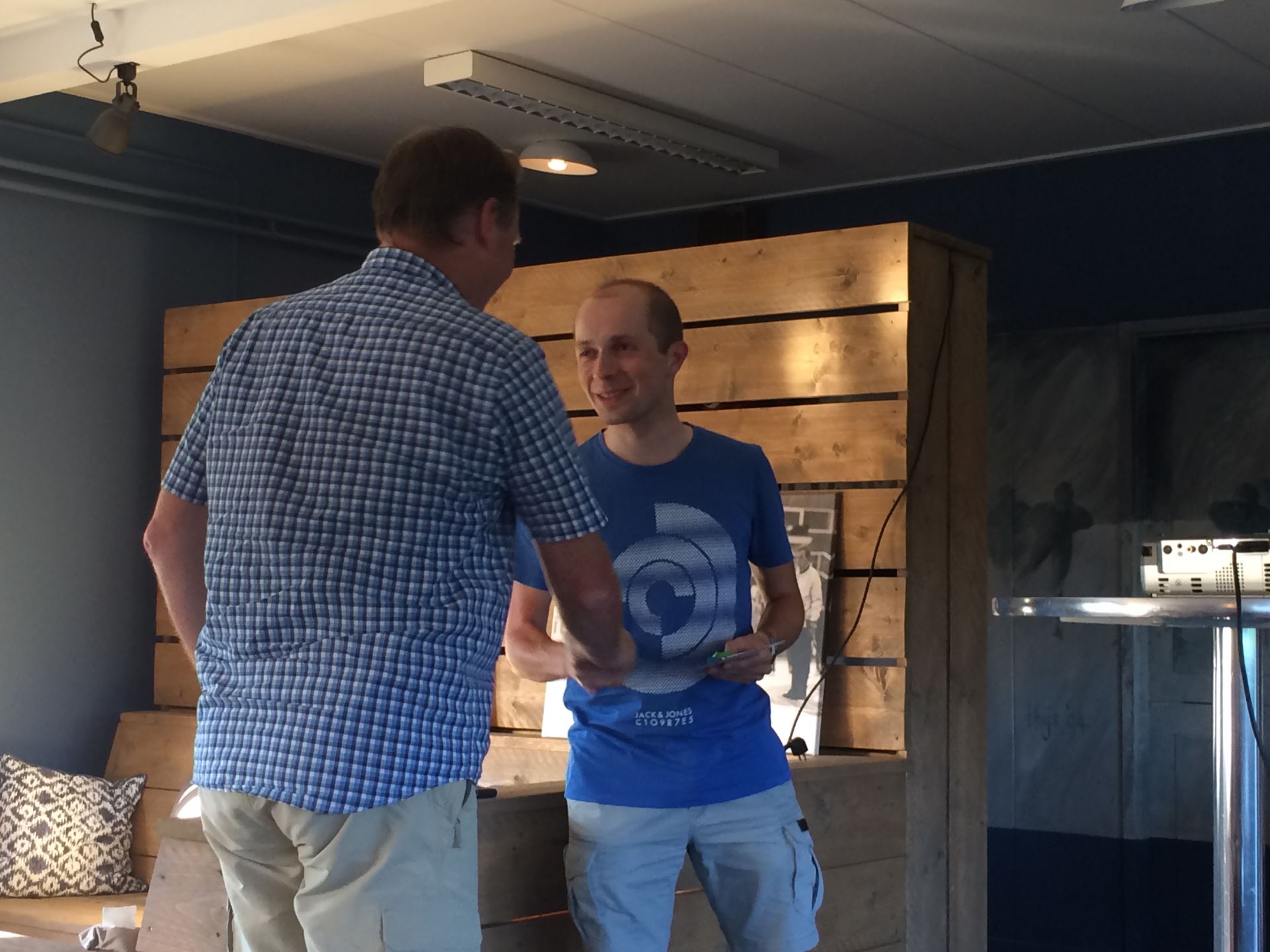 Laurens Achterkamp werd verkozen tot marathonrijder van het jaar en kreeg een bon uitgereikt door Erik Klok.
