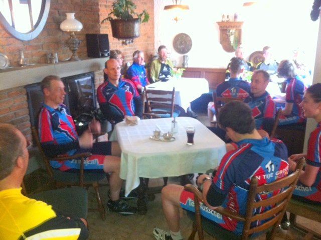 Na ongeveer 50 km en een flink aantal klimmen was daar dan de "kaffee mit kuchen", daar hadden wij even de tijd om op adem te komen, bidonnen bij te vullen en lekker wat te eten. Er werd bij aankomst al opgekeken naar het vertrek bij de Kaffee mit kuchen, want zoals verwacht toen wij weer op de fiets stapten waren de benen helemaal stijf en waren er weer een paar kilometers nodig om de spieren op te warmen.