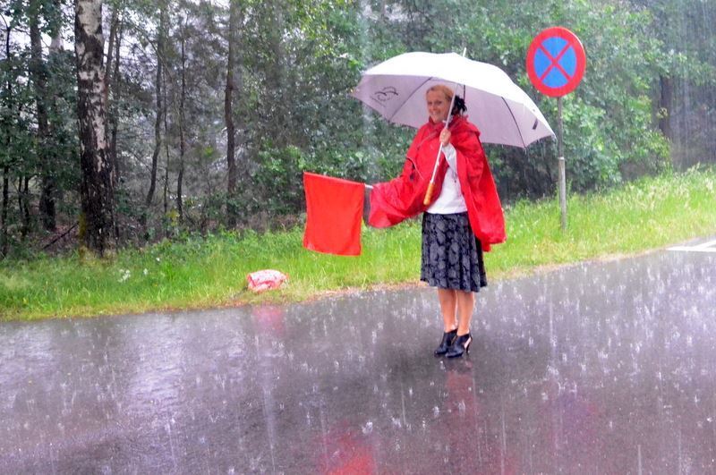 Bij het keerpunt stond Marijke te zwaaien met een rode vlag en sommige rijders keken hoopvol of dit het teken was dat de tijdrit gestaakt werd, maar nee. Een enkeling was de regen niet gek genoeg en reed nog wat extra meters: Job nam het keerpunt heel ruim en reed helemaal door tot de parkeerplaats.