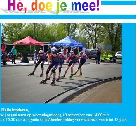 Neem zelf skeelers/skates, een helm en knie-,pols- en elleboogbeschermers mee. Voor kinderen van 6 t/m 13 jaar.