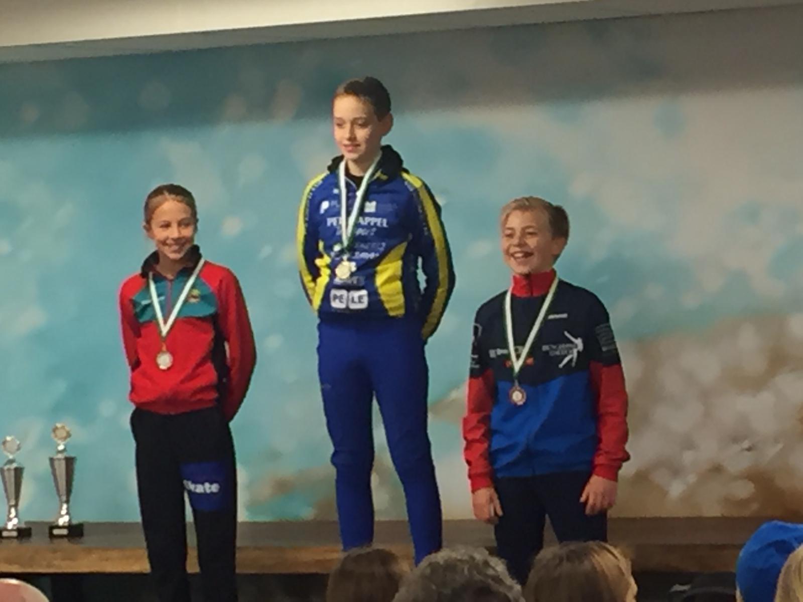 Edsger kreeg een bronzen medaille voor zijn podiumplek bij de pupillen B. Rens had ook goede papieren bij de pupillen A, tot hij in de laatste rit wat aanwijzingen voor andere schaatsers verkeerd begreep en pardoes vlak voor de finish in de andere baan finishte. Een PR met 5 sec maar ook een DSQ.