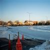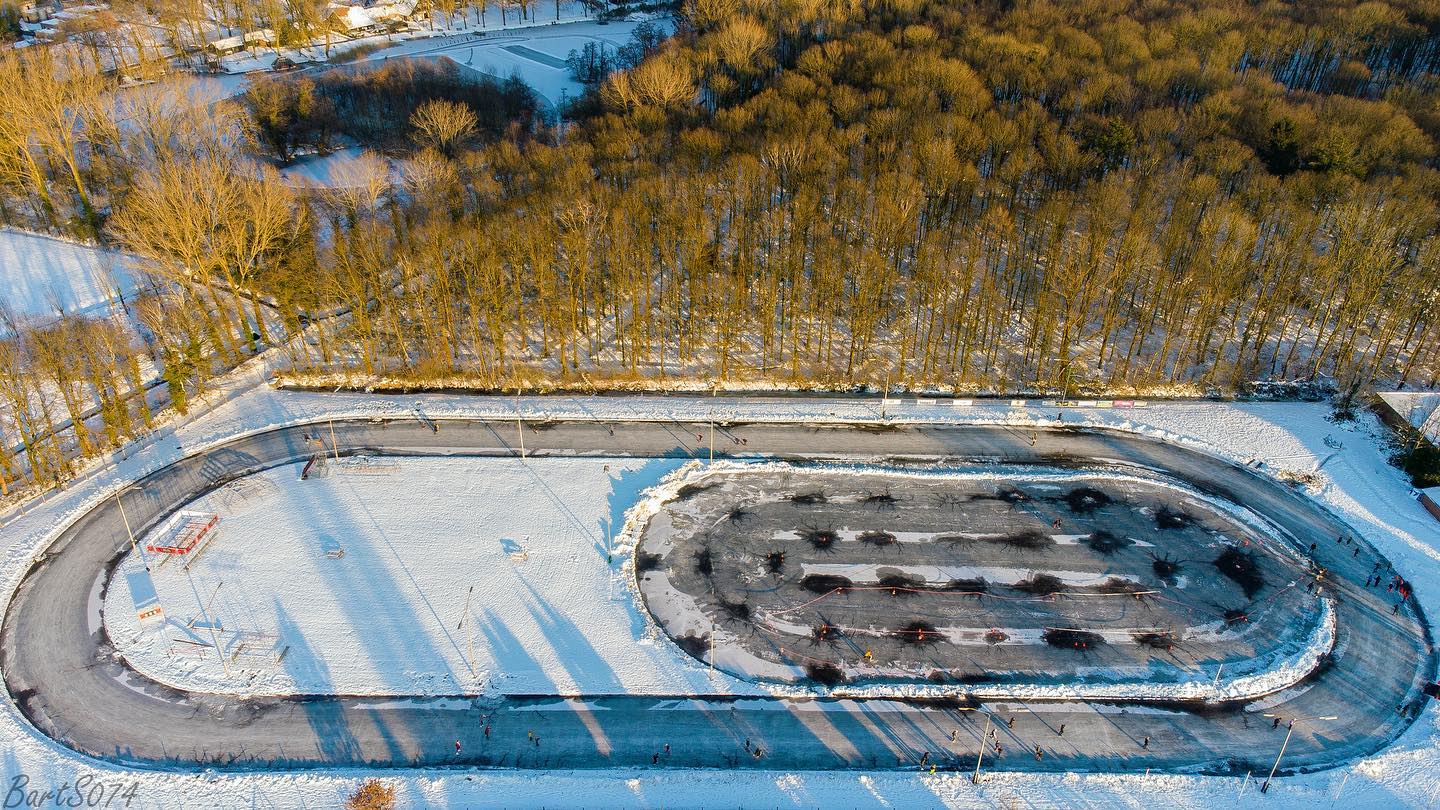 De ijsvloer groeit goed. Wel hobbelig door de restanten van de sneeuw, maar dat krijgt de Zamboni wel weg aldus George. Probleem is alleen de putten die diep onder de grond doorlopen. Deze veroorzaken circulatie van relatief warm water en daardoor veroorzaken ze zwakke plekken. Op onderstaande luchtfoto is goed te zien dat boven de putten de donkere plekken in het ijs ontstaan.