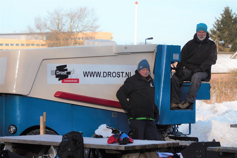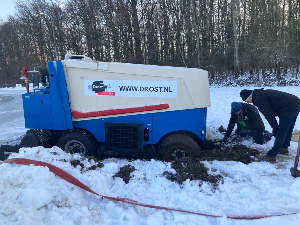Vrijdagmorgen om 6 uur laten de ijsmeesters George en Luc het water weglopen en begint het prepareren van de baan met de Zamboni. Als ik rond 8 uur op de baan kom zie ik ze bezig met de ijsveger naast de baan. Ze waren iets te ver doorgereden bij het uitladen van het ijs en de voorwielen zijn diep weggezakt in de modder.