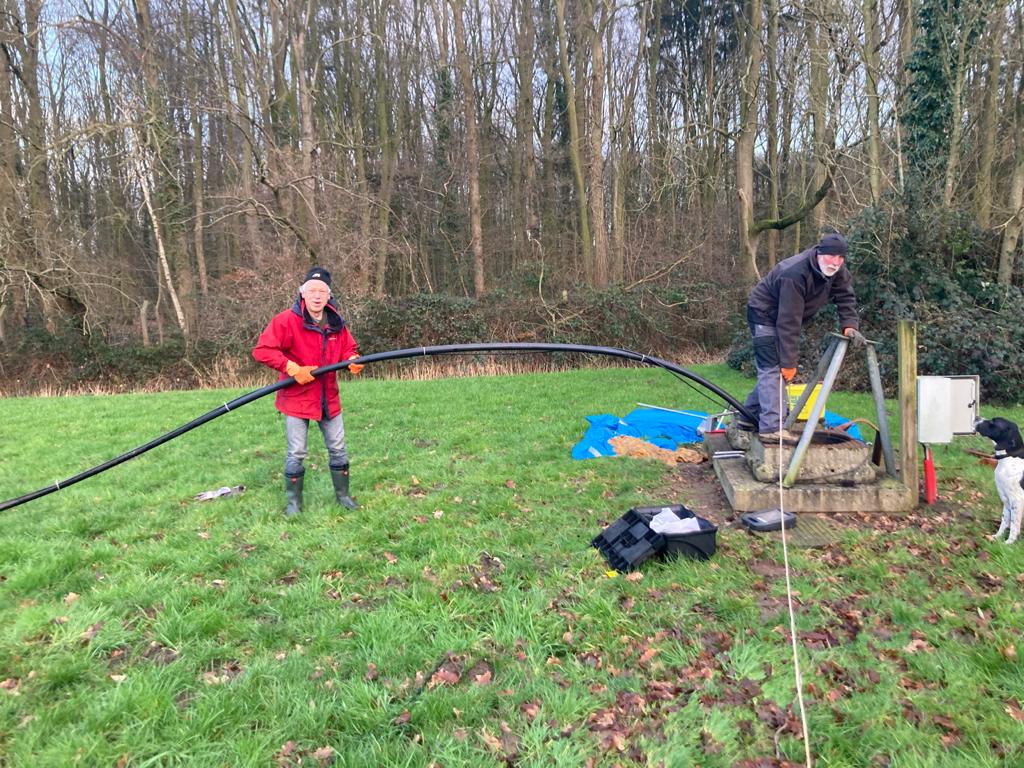 Op 4 februari sluiten Andre en George de pomp aan. Het is nog helemaal niet koud en het grasveld naast de baan is een modderige bende. Op de foto zijn nog de blauwe zakken met isolatiemateriaal zichtbaar die door de hoge stand van het grondwater kletsnat zijn geworden. Gelukkig ligt de pomp heel diep en bevriest deze niet zo snel. De baan loopt in ongeveer 14 uur onder water en de volgende ochtend vroeg kan de pomp weer uit.