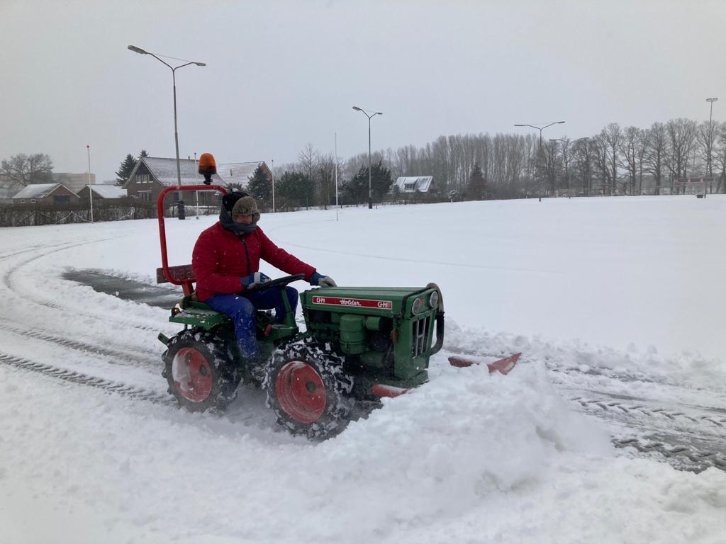 Maandagmiddag komen 14 vrijwilligers naar de baan om hem sneeuwvrij te maken. We hebben via de gemeente om hulp gevraagd, maar nog geen antwoord gekregen. Onze zitmaaier is voorzien van een sneeuwschuiver om te helpen.