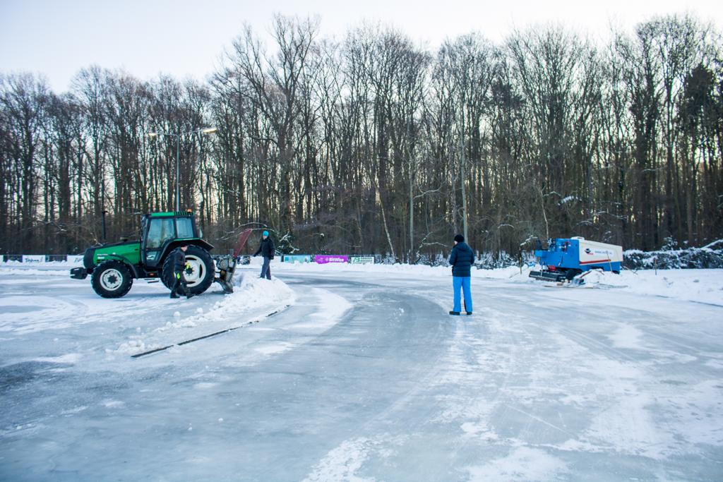 Gelukkig komt Gildebor nog een keer helpen. Een trekker met een lier komt aangerukt en na korte tijd kunnen we verder met de baan prepareren. Met de Zamboni schaven we de ruwe stukken van het ijs en wordt een laagje water op het ijs aangebracht.