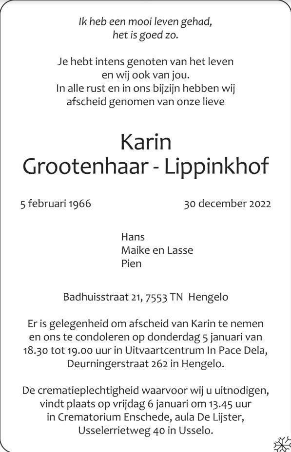 Afgelopen week kregen wij het trieste bericht dat op 30 december 2022 Karin Grootenhaar is overleden.