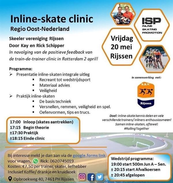Inline-skate clinic 20 mei vindt er in Rijssen een train-de-trainer clinic plaats. Deze clinic wordt gegeven door Kay en Rick Schipper. Zie voor meer info de afbeelding Evenement datum:20-5-2022 17:00 - 18:15 Marike ter Maat 20-5-2022 17:00 - 18:15 Aantal weergaven (1367) Trefwoorden: inline-skatenclinicrijssen Mocht u het niet eens zijn met de publicatie van een foto kunt u dat per e-mail kenbaar maken aan de webmaster (webmaster@hijc.nl). De foto wordt dan zo snel mogelijk verwijderd.