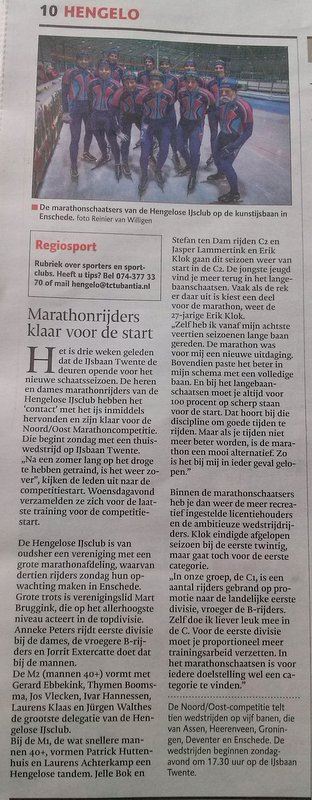 Marathonrijders klaar voor de start Zondag 19 okt gaat de Noord Oost marathoncompetitie van start op IJsbaan Twente. De HIJC is als vanouds zeer goed vertegenwoordigd. Lees hier het artikel in TC Tubantia. Klik hier om het hele artikel te lezen. Meer informatie over de marathongroep van de HIJC vindt u op de marathonpagina. Informatie over de Noord Oost competitie, zoals data, deelnemers en inschrijfinformatie staat op marathonschaatsenregiono.nl/. Brigitte Huttenhuis vrijdag 17 oktober 2014 Aantal weergaven (3972) Trefwoorden: marathonschaatsen Mocht u het niet eens zijn met de publicatie van een foto kunt u dat per e-mail kenbaar maken aan de webmaster (webmaster@hijc.nl). De foto wordt dan zo snel mogelijk verwijderd.