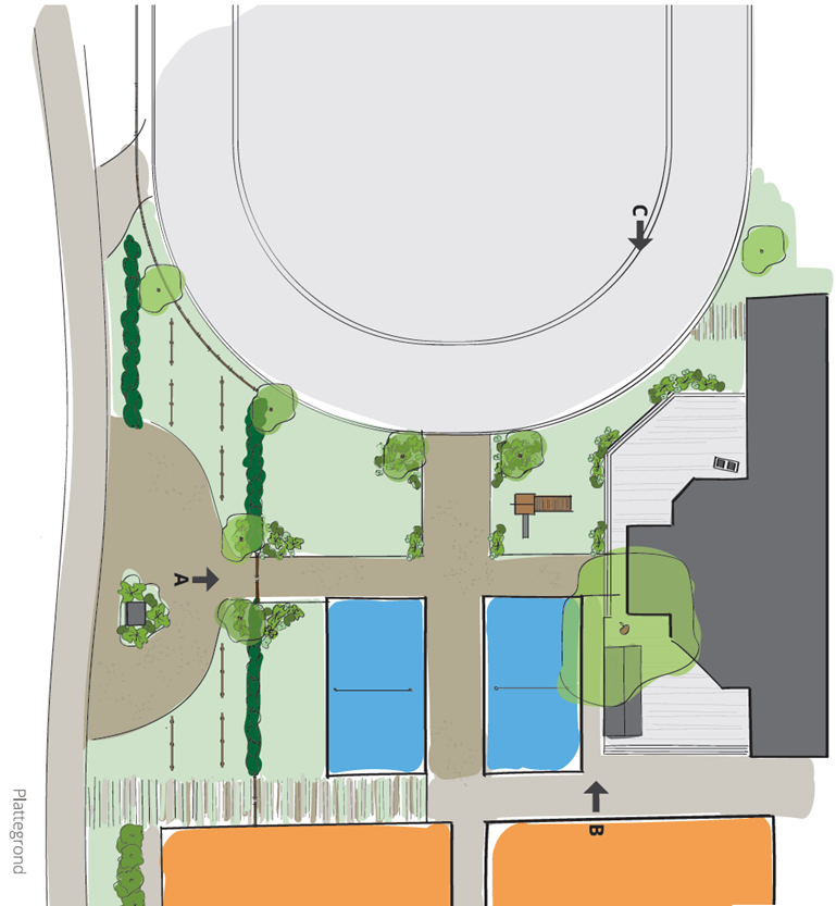 Maar hoe zit het nu? Tennisvereniging Weusthag heeft aangegeven graag twee padelbanen (blauwe vlakken op tekeningen) te willen aanleggen op hun terrein. Hiervoor willen zij dan hun kleedruimten en het speeltuintje opofferen. Probleem zou dan wel zijn, dgezien de afmetingen van de banen, dat deze strak tegen ons clubhuis zouden komen te liggen. Dit lijkt niet wenselijk.