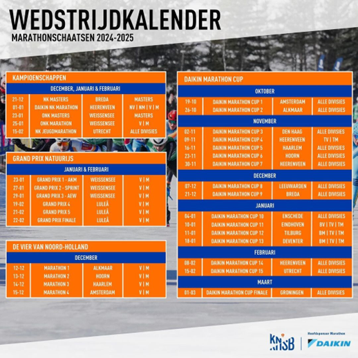 Voor de komende wedstrijden hoop ik wat aanvallender te kunnen rijden. Misschien lukt het om mee te schuiven in een aanval of mijn sprint net wat beter af te ronden. In de komende weken staan, zoals te zien op de kalender, Haarlem, Hoorn, Heerenveen en Leeuwarden op het programma. Alle wedstrijden zijn live te volgen op livemarathon.schaatsen.nl.