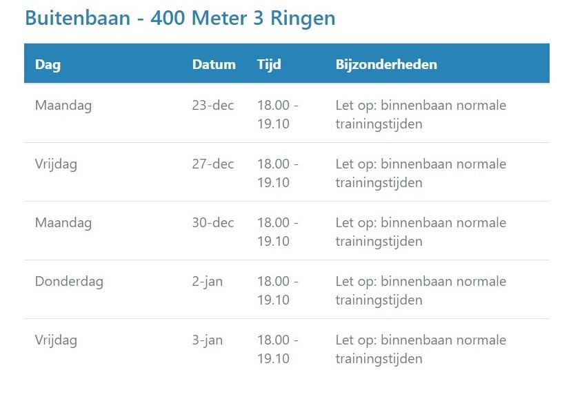 In de kerstvakantie is er geen training op 24/25/26/31 december 2019 en 1 januari 2020. Op de andere trainingsdagen zijn er voor de buitenbaan trainingen samengevoegd op één uur.