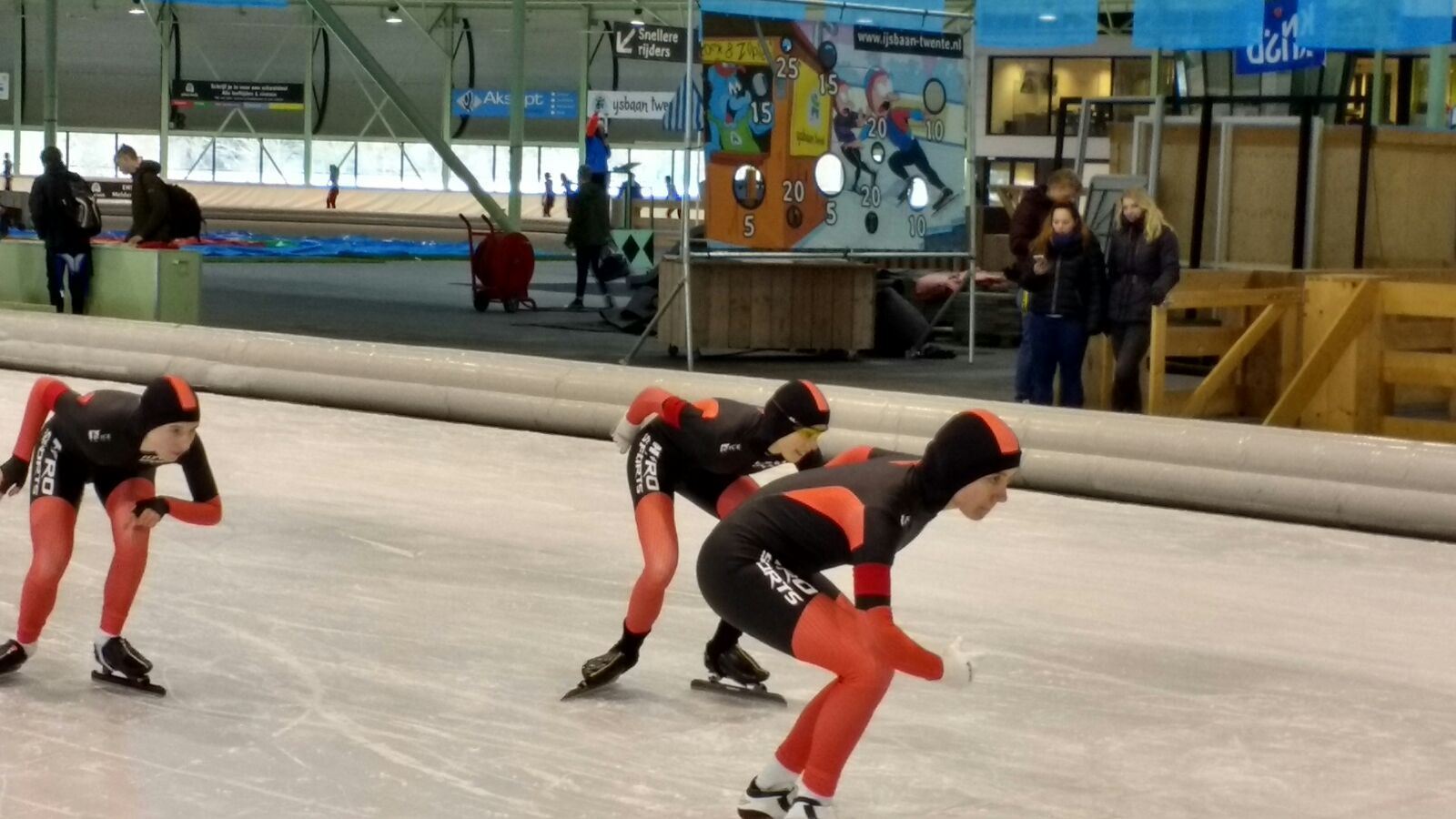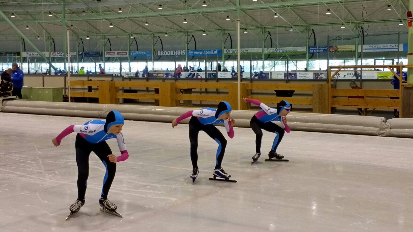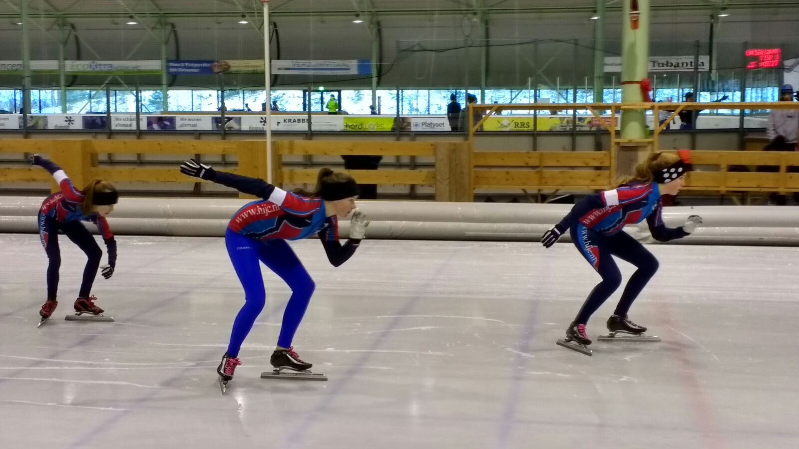 In de categorie dames boven de 15 jaar hadden we twee teams; de eerste bestond uit Isa en Ella Groenewoud. Zij schaatsten samen met Pien Grootenhaar naar een hele nette 3e plaats. De groep met Tessa Huttenhuis, Maud Jongman en Roos ten Dolle was na de eerste omloop nog de snelste en een ticket naar het NK lag op hen te wachten. In de tweede omloop waren ze nog sneller, maar helaas was het Noordik net een seconde sneller. Dus ook voor deze toppers net geen NK.