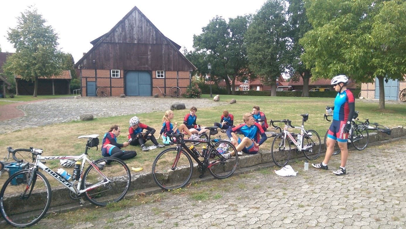 Zondag stond er een mooie duurrit op het programma. Ook nu weer ruim honderd kilometer voor de wielen met uiteraard het nodige klimwerk. Eerst een korte aanloop richting Hagen, en dan via Tecklenburg (zwembadklim, televisietorens) en Lienen (klim naar Holperdorp) naar Bad Iburg. Mooi om te zien hoe de jonge garde zich nadrukkelijk melde aan de kop van de “de koers”. Ook na de pauze in Bad Iburg was het spel weer goed op de wagen en voor we het wisten waren we alweer terug in Osnabrück.