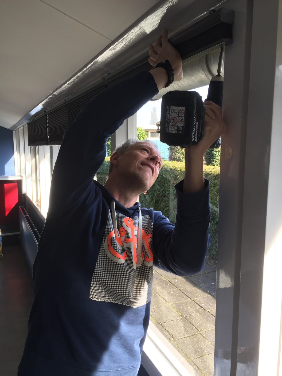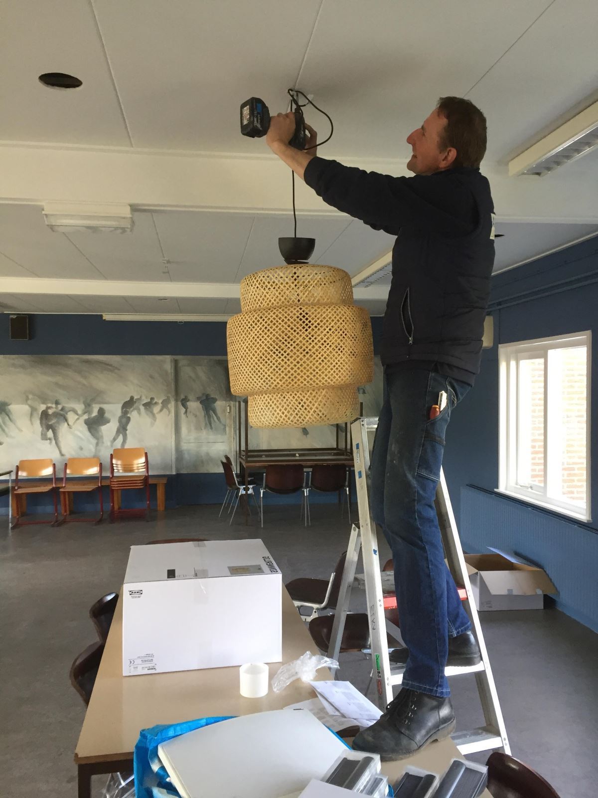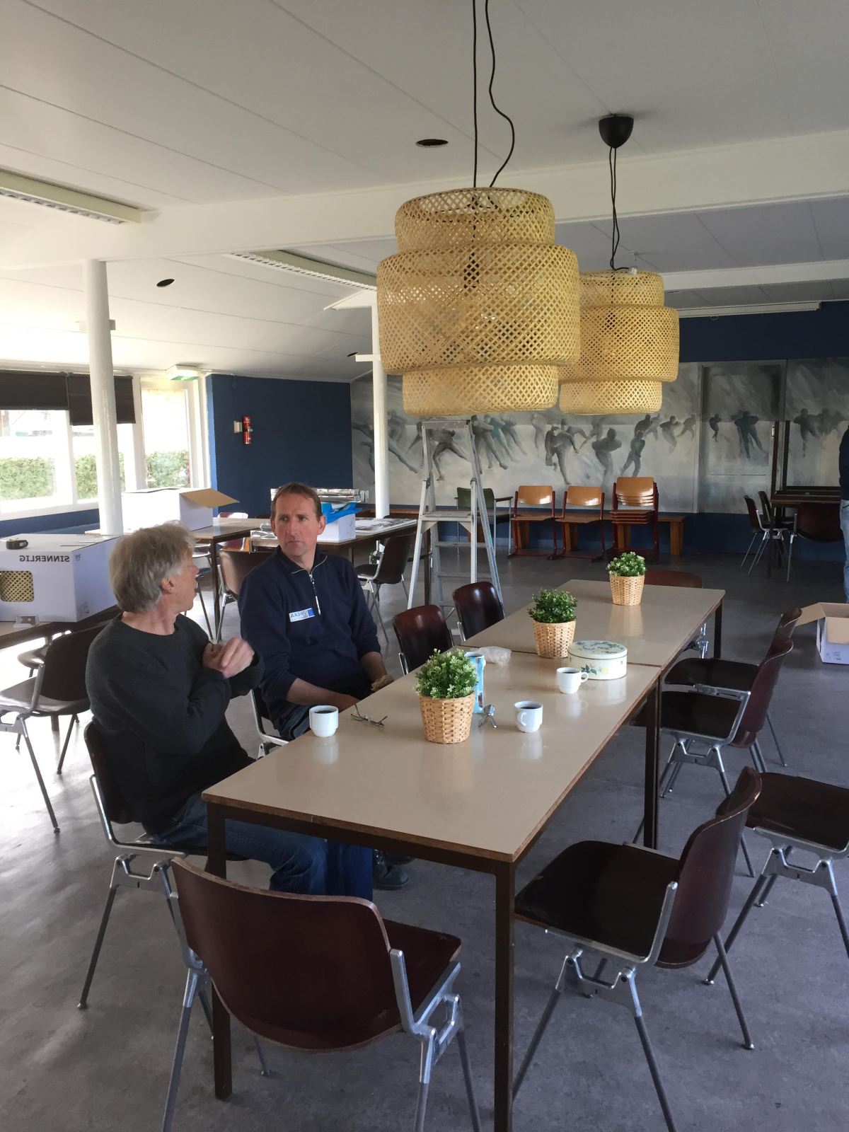 Hans Grootenhaar, André van de Berg, Bob Groenewoud en Laurens Klaas van Elka Install hebben vandaag hard gewerkt in het clubgebouw. Er is zonwering aangebracht en na veel gepuzzel hebben we de lampen opgehangen waar straks de nieuwe tafels komen.