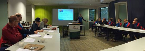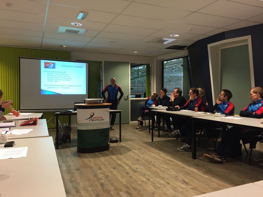George Bouret hield daarna een interessante presentatie over de theoretische achtergrond van de richting van het afzetten en andere details van de schaatsbeweging. Die finesses van de techniek zorgen ervoor dat het schaatsen altijd een uitdaging blijft. Ook voor de zeer ervaren schaatstrainers is het interessant om van mening te wisselen wat je nu wel en niet moet aanleren en welke oefeningen nuttig zijn.